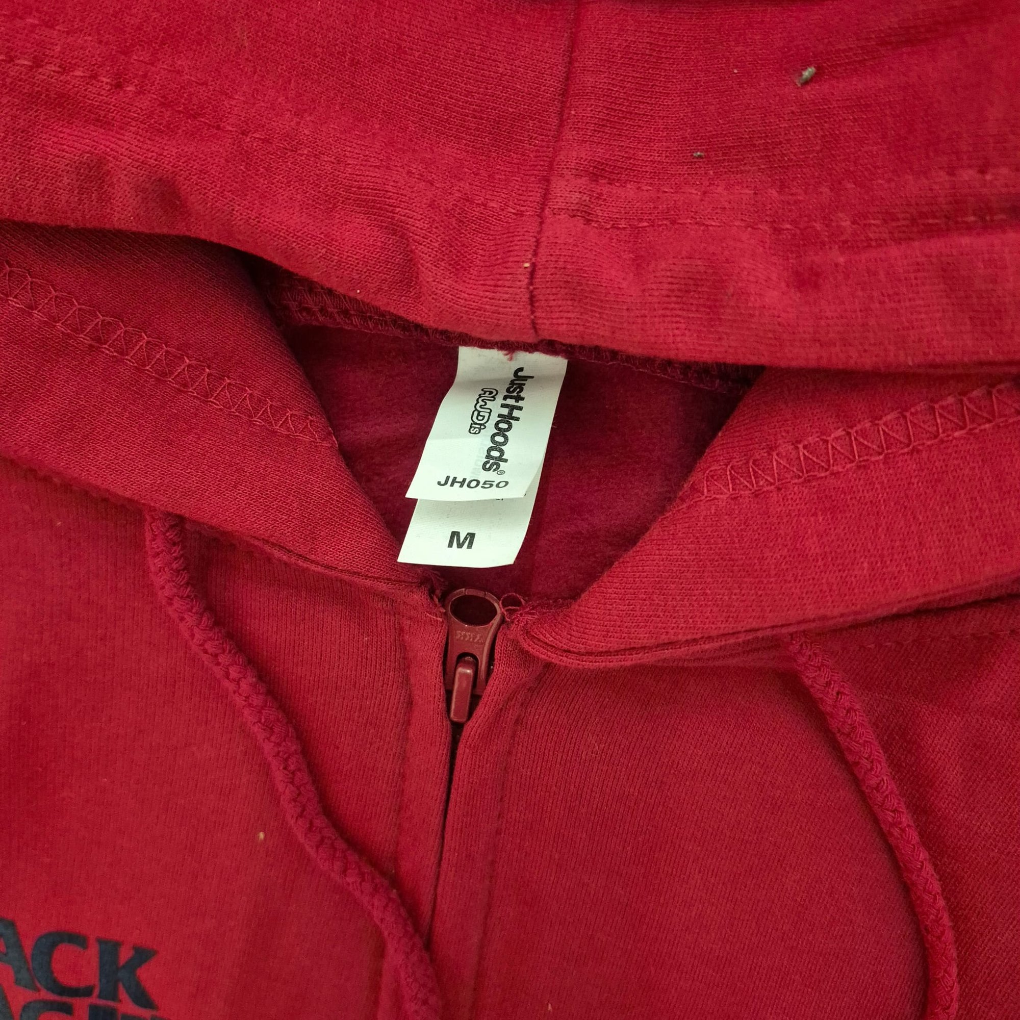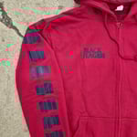 Navy ink printed on red AWDis JH050 zipper hoodie.