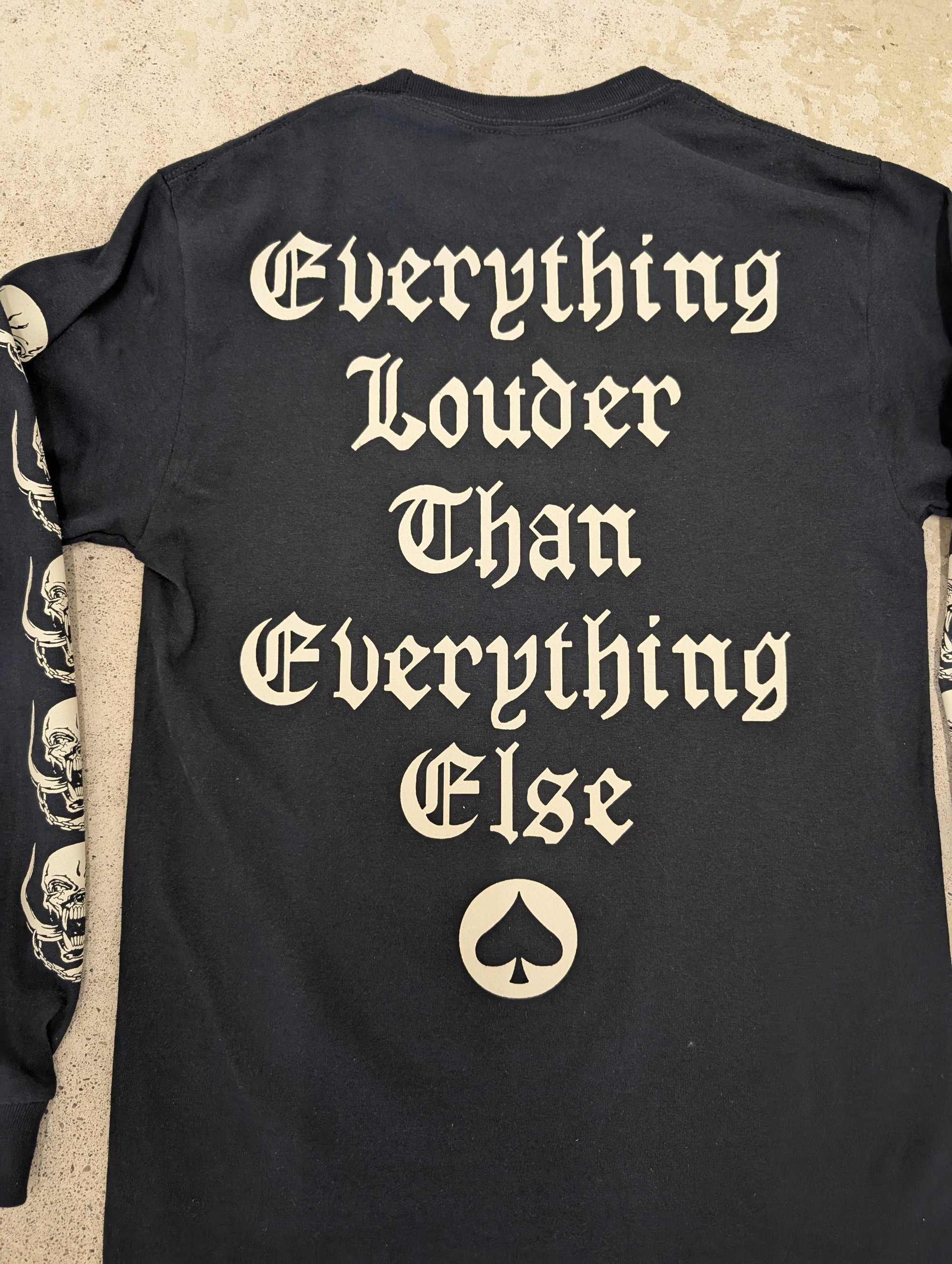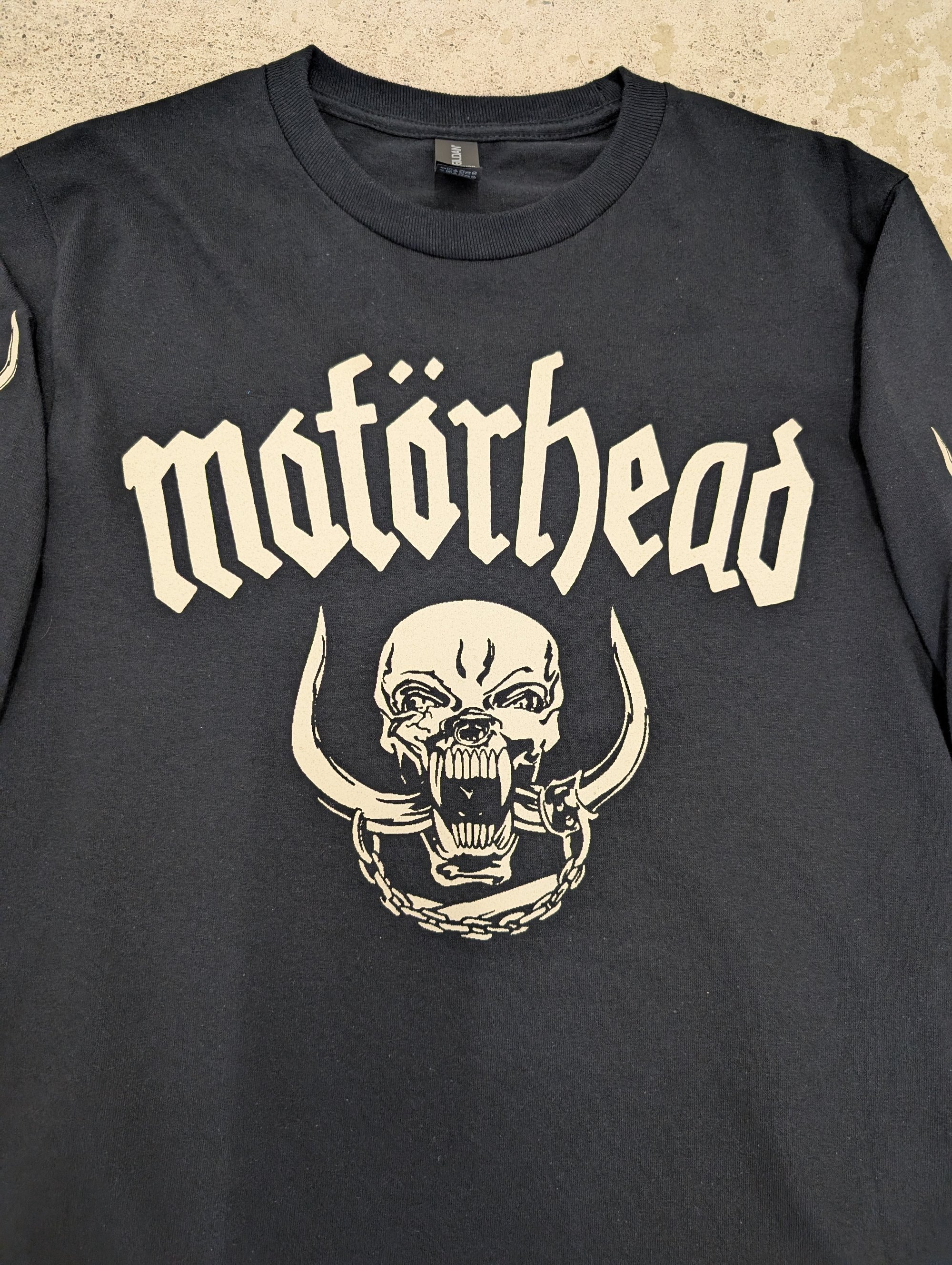 Off-white coloured ink, hand screened, with love, onto black Gildan Ultra Cotton longsleeve t-shirts.